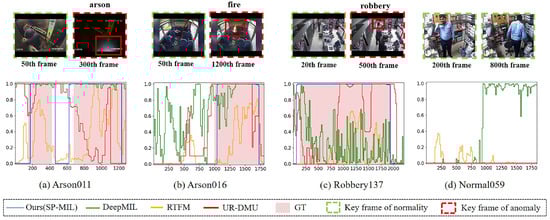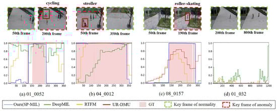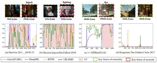 In this section, we present the qualitative results of our RTFM+SP-MIL and three baseline models (DeepMIL, RTFM, UR-DMU) on the UCF-Crime, ShanghaiTech, and XD-Violence datasets. Figure 5, Figure 6 and Figure 7 show that our framework can locate abnormal events more effectively than the baseline models. For the UCF-Crime dataset, Figure 5a–c demonstrates that the positioning curve of our framework closely aligns with the ground truth. Even when the abnormal events occur intermittently in Figure 5a, our detecting results are only slightly delayed or advanced. This highlights the robustness and accuracy of our framework in detecting abnormal events, such as arson and robbery. Additionally, Figure 5d illustrates that our framework has a low false positive rate. Similar conclusions can be drawn from the positioning curves of the ShanghaiTech and XD-Violence datasets. In addition, Figure 6b illustrates that the classifiers in RTFM and DeepMIL exhibit a bias in localizing anomalies, resulting in delayed anomaly detection, while the classifiers in UR-DMU cause significant false alarms. In contrast, our method effectively identifies the location of anomalies. This highlights the effectiveness of our SP-MIL strategy in providing unbiased predictions. Although our framework exhibits a few false positives in Figure 6a and Figure 7c, overall, our detecting results accurately promptly reflect the real anomalies in the videos.