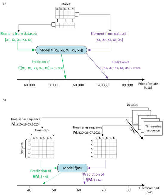 As illustrated in Figure 3, all three examples mentioned above are regression-based problems with real-valued predictions. However, predicting real-estate prices can be conducted using a single vector of features x, where the features might include distance from the city center (), crime rate (), age of the estate (), and so on.