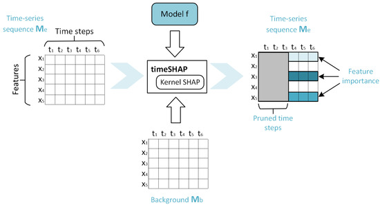 There are several methods available for explaining predictions made by models using time-series data. One such method is timeSHAP [54], which builds upon the Kernel SHAP framework and incorporates base values to explain predictions. It is schematically described in Figure 4. The method is specifically designed to handle time-series data, taking into account the temporal dependencies within the data. However, when the model input is not a vector with features but a matrix M with rows and columns (as is the case with time-series data), the input used to predict the base value must also be a matrix.