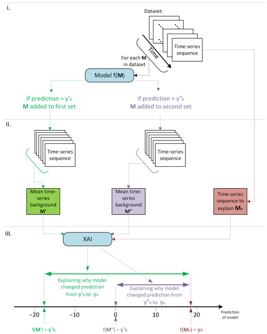 For example, if a user wants to explain why a model predicted a specific value in comparison to , the user can select from dataset all time-series sequences M that result in the prediction of , following the steps of the Mean Background Method depicted in Figure 5. This results in a new set of backgrounds . However, instead of creating a single mean background, each sequence is used as a background individually, one at a time. This approach results in numerous Shapley values for each feature.