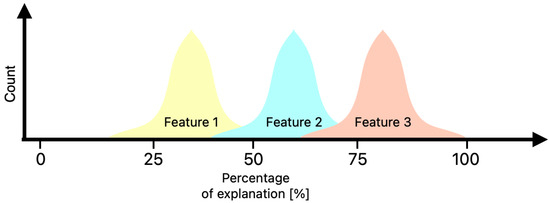 In Figure 6, importance percentages of three features are presented. The three columns, corresponding to features and from matrix E, are used to form histograms visible in Figure 6. This visualization makes it easy to understand the distribution of importance. It is also much easier to compare importance of each feature for different values of when they are in percentages. If the distribution of percentage importance for a particular feature is wide and short, it indicates high fluctuations, making the importance assigned to this feature uncertain and potentially risky to use. Conversely, if the distribution is narrow and tall, the importance for the feature is stable across the backgrounds for the given .