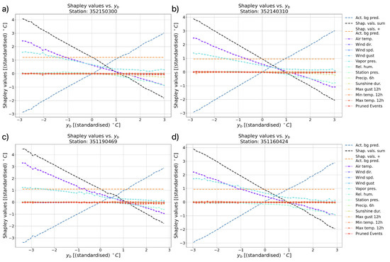 - an XAI method is applied to explain the changes between and . In Figure 5, there are two values, and , which result in two different explanations for each feature. For example, moving the temperature prediction from °C to °C might be influenced by different features than moving the prediction from °C to 24 °C.