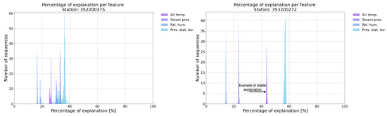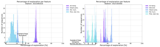 A detailed analysis of the percentage of explanation distributions for four stations is presented. Not all the features are included in Figure 8 and Figure 9; only the features with a mean percentage of explanation equal to or greater than 2% are shown. Several significant observations can be made. The station in Figure 8 on the right is an example of a relatively stable explanation across the given set of backgrounds, resulting in the prediction . The Shapley values for each feature do not fluctuate significantly across the different backgrounds in the entire dataset. This is reflected in the thick and high histograms.