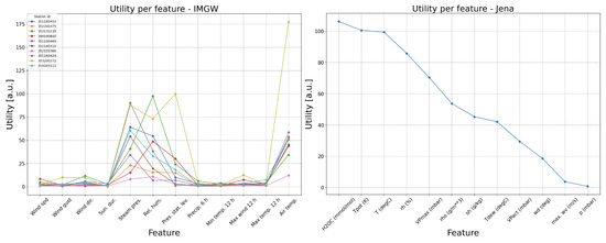 The utility indices for the stations discussed above can be verified. In the case of station 353200272, for which the explanations were visibly stable, high utility values are notable. Air temperature has a much higher utility value, even though it does not explain as much as “Pressure at station level”. However, it has a significantly lower standard deviation, and, as a result, it was rewarded for its stability.