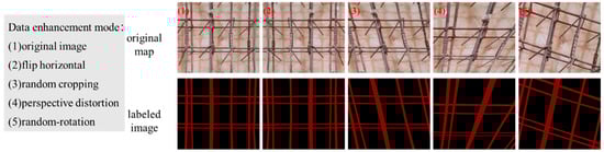 After acquiring the original images of the reinforcing mesh, manual annotation was performed using the open-source labeling software Labelme3.16.7 to obtain the mask labels for the reinforcement. A polygon was used to outline the edges of each instance of reinforcement, and the enclosed area of the polygon was considered the reinforcement mask. Each individual rebar, node position, and its geometric attributes within the mesh were precisely annotated. Moreover, the dataset includes various complexities commonly encountered in construction environments, such as reflections on the reinforcement surface, coatings, and stains, to enhance the model’s robustness and adaptability.