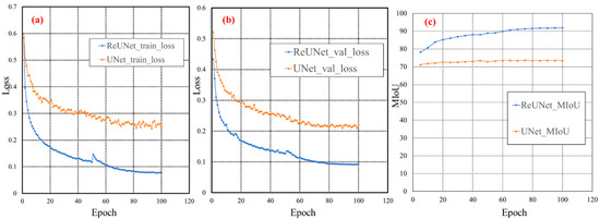 Comparison of model performance during training, validation, and testing: (a) comparison of loss values of different models during training; (b) comparison of loss values of different models during validation; (c) comparison of MIoU of different models during testing.