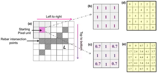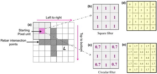 Feature detection performance of different filters under regular rebar mesh distribution: (a) Filter Traversal Process Diagram; (b) Square Filter; (c) Circular Filter; (d) Image Features After Filtering with a Square Filter; (e) Image Features After Filtering with a Circular Filter.