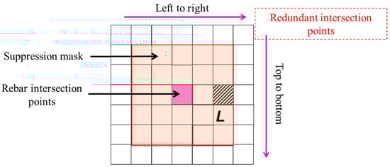 In the circular-like filtering operation, each pixel is covered by the filter kernel, and the number of non-zero pixels in the local area is calculated. Since intersection points exhibit higher pixel values, the filtering operation can determine whether a point is an intersection by setting a reasonable threshold. When the threshold is set to 20% of the maximum distance within the filter area, the pixel exceeding the threshold is considered a potential intersection and is retained with a value set to 255; otherwise, it is set to 0. This threshold-based statistical method allows the circular-like filter to accurately extract the locations of intersection points. Once intersection detection is complete, the results are saved as a binary image using the OpenCV module. The detected intersection points can then be directly utilized for subsequent reinforcement spacing measurements and analysis.
