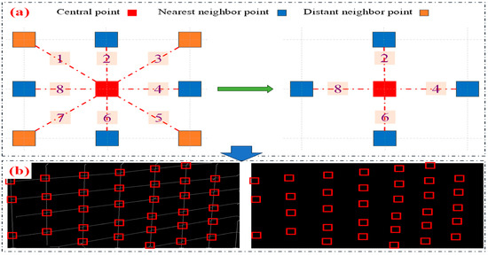 Step 1—Intersection Classification: After completing intersection detection, the first task is to classify the intersections. This is performed by calculating the Euclidean distance and the absolute slope between each intersection and its neighboring intersections. The intersections are classified based on the slope of the lines connecting them to their neighboring points. Intersections with larger slopes are typically considered longitudinal intersections, while those with smaller slopes are classified as transverse intersections. Each intersection is calculated 8 times during the spacing measurement to ensure that the distances to all the neighboring points are fully considered. Finally, the four closest intersections representing the vertical and horizontal directions will be retained.