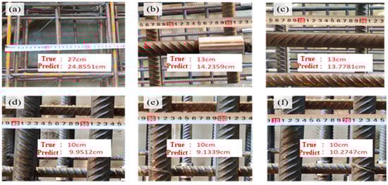 Actual detection results of rebar mesh spacing: (a–f) Comparison of Detection Results and True Values for Different Rebar Specimen Spacings.