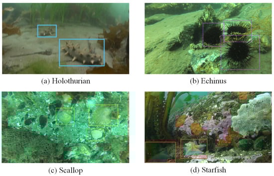 We used the DUO dataset [31], which consists of 7782 high-resolution underwater images in total, with 74,514 labeled aquatic organisms. The training set contains 6671 images while the test set contains 1111 images. Aquatic organisms are classified into four categories: holothurian, echinus, scallop, and starfish. The instances in the training and test datasets are presented in Table 1, and some sample images from the dataset are shown in Figure 1.