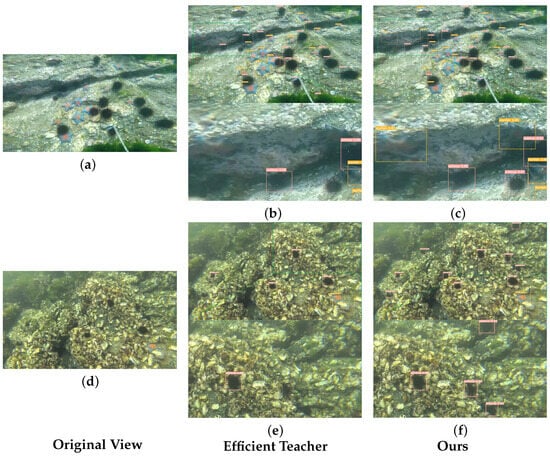 Compared to Figure 7b,c, when we zoom in on the darker areas in the image, it becomes apparent that Efficient Teacher failed to detect two starfish and one echinus in the region. In general, our method demonstrates better detection performance. Furthermore, compared to Figure 7e,f, Efficient Teacher missed a significant number of echinuses, especially in the selected zoomed-in areas.