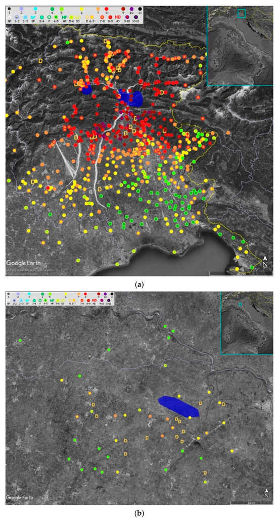 (a) Macroseismic field of the 6 May 1976 event (CPTI15) [1,2]. Blue polygons are the surface projection of the two main asperities, as modeled in [10]. (b) Macroseismic field of the 20 May 2012 event (CPTI15) [1,2]. The blue polygon is the surface projection of main asperity, as modeled in [16].