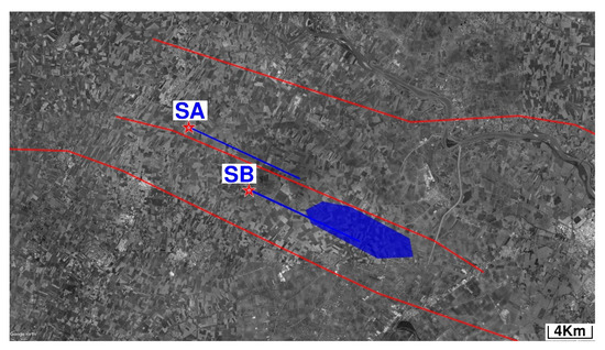 SA and SB: best representatives of two families of solutions for the 20 May 2012 event; blue polygon: area of maximum deformation after [16]; red lines are known thrusts (all dipping southward) [36].