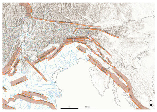 - Poli, M.E.; Burrato, F.; Galadini, F.; Zanferri, A. Seismogenic souces responsible for destructive earthquakes in north-eastern Italy. Boll. Geofis. Teor. Appl. 2008, 49, 301–313. [Google Scholar]
