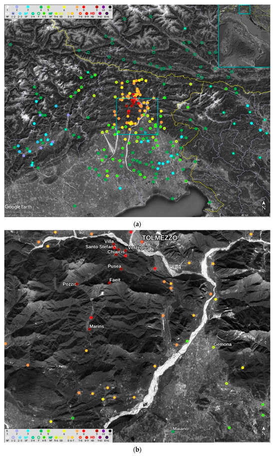 (a) The 27 March 1928 macroseismic field [1,2]. (b) Zoom in of (a) that encompasses the macroseismic epicentral area and the Gemona alluvial fan. Locality names refer to those cited in the text.