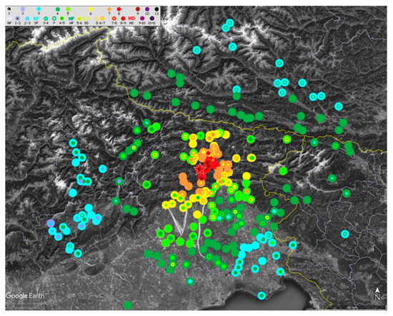 - Locati, M.; Camassi, R.; Rovida, A.; Ercolani, E.; Bernardini, F.; Castelli, V.; Caracciolo, C.H.; Tertulliani, A.; Rossi, A.; Azzaro, R.; et al. Database Macrosismico Italiano (DBMI15); Versione 4.0; Istituto Nazionale di Geofisica e Vulcanologia (INGV): Rome, Italy, 2022. [Google Scholar] [CrossRef]