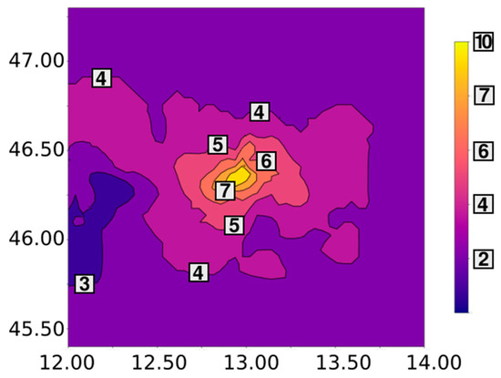 The figure shows the isoseismals of the Mwp6 27 March 1928 earthquake, interpolated using the natural neighbor method [50].