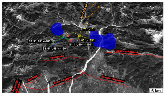 S1, S2, and S3: best representatives of three families of solutions (only dip and rake are reported); yellow: solutions after [42] (only dip and rake are reported); blue polygons: areas of maximum deformation after [10]; red and orange lines: active thrusts and strike-slip faults, respectively (all dipping toward the labels), after [33].