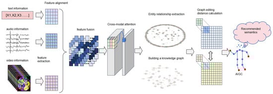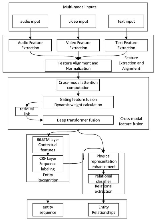 In entity relationship extraction tasks, effectively integrating multimodal data is crucial for constructing comprehensive and accurate knowledge graphs. Online course resources typically contain rich text, video, and audio information, each modality describing course content from different dimensions. For instance, visual demonstrations in videos clearly illustrate hierarchical relationships between concepts, instructors’ gestures and expressions convey concept importance, and tonal variations and emphasis in audio highlight key knowledge points. Therefore, this section proposes an end-to-end multimodal entity relationship extraction framework that enhances extraction accuracy and completeness through deep fusion of these complementary information sources.