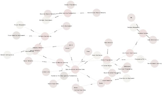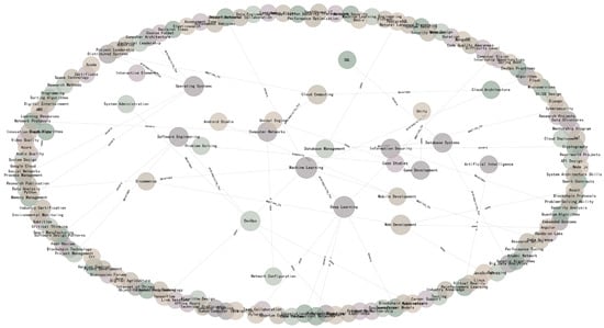 For entity extraction, based on multimodal features and ranked by importance, three main entity types were identified: course names, knowledge points, and skills. This section does not include the following course entities in the visualizations: “course content”, “difficulty level”, “duration”, “rating”, “interactivity”, “multimedia type”, “teaching style”, “course structure”, “learning objectives”, “prerequisites”, “update frequency”, “language”, “certification type”, “course category”, “subject area”, “practical opportunities”, “assignment difficulty”, and “exam format”. The resulting entity relationship graph is shown in Figure 7.