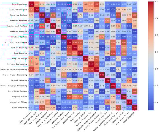 Figure 10 shows the approximation accuracy of the graph edit distance. The scatter plot indicates that most points are distributed near the ideal fitting line, demonstrating that our approximation algorithm can accurately estimate the actual graph edit distance. The calculated correlation coefficient is 0.9569, suggesting that using an efficient approximation method instead of an exact but time-consuming graph edit distance calculation can improve system response speed while maintaining accuracy. Figure 9 presents the similarity matrix between different courses in the form of a heat map.