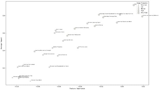 From Figure 13, we can see significant differences in the influence of various features on the recommendation system. The x-axis represents feature importance, and the y-axis shows the average impact of each feature. Features in the upper right corner have a substantial impact on the system’s decisions, while those in the lower left have a relatively smaller impact. The size of each dot represents feature usage frequency, with larger dots indicating higher frequency. Among these, features like “knowledge graph coverage”, “current learning goal”, and “course rating” have higher SHAP values, indicating their crucial role in the model’s decision-making. For example, knowledge graph coverage effectively reflects the match between user learning needs and the course, thus enhancing recommendation accuracy.