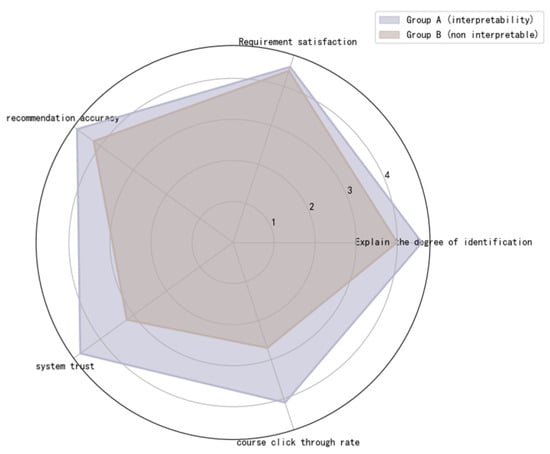 According to the A/B test results, adding interpretability significantly improved user experience. The explainable recommendation system (Group A) outperformed in explanation acceptance, need fulfillment, recommendation accuracy, and system trust. Especially in explanation acceptance and system trust, users’ understanding and confidence in the recommendations were significantly enhanced, although the improvement in course click-through rate was limited.