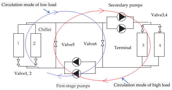 As shown in Figure 3, according to the research results of Song, F.L. et al. [16], the transformed secondary pump system adopts bidirectional variable flow technology. The working principle is as follows: A bypass balancing pipe with an electric control valve (valve 5) is installed at the chiller side, and a bypass load balancing pipe with an electric control valve (valve 6) is installed at the terminal side. Based on changes in the terminal load, the control system adjusts valves 5 and 6 to balance cooling capacity and chilled water flow, thereby improving the system’s reliability and energy efficiency. This is achieved within a specific range, where the pressure difference across different terminal branch circuits remains relatively consistent, optimizing the secondary pump system’s performance. After applying bidirectional variable flow technology, the number of pumps is significantly reduced, the number of pipeline valves is reduced, and resistance is reduced by utilizing idle pipeline diameters. The flow and head of the pump group are effectively distributed, the conveying efficiency of the pump group is improved, and the failure rate is greatly reduced.