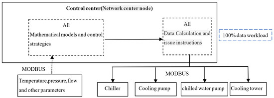 As shown in Figure 5, the control structure of a conventional air-conditioning refrigeration control system is a centralized control structure (network center node). All the collected temperature, pressure, flow, and other signals are processed by the centralized control structure, which then issues commands to drive the relevant equipment. As the network center node of the control system, the control center contains all the mathematical models and logic strategies of the control system and undertakes all the work of data calculation and command release.