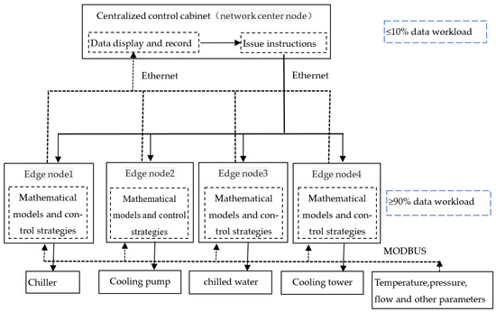 As shown in Figure 6, an optimized architecture (edge computing architecture technology) for distributed computing is implemented. A large number of computations that were originally handled entirely by the centralized control cabinet (network center node) are divided into smaller, more targeted, and easier-to-handle parts, and scattered to the edge nodes (The edge nodes refer to the control cabinets or control boxes distributed at various locations in the refrigeration station, such as the chillers, cooling towers, cooling water pumps, and chilled water pumps.) to deal with. Because each edge node can work independently, the network center node only takes up less than 10% of the data calculation work, and the edge node takes up at least 90% of the data calculation work. The control terminal (network center node) is only used as a platform to display and record data, perform manual operation, and issue integrated instructions. After each control cabinet or control box (edge node) collects the related equipment signal independently, the data and logic strategy is processed by the mathematical models (The mathematical model refers to the control models established by the control modules in each edge node control cabinet based on thermodynamic theories and empirical methods related to chillers, cooling towers, cooling water pumps, and chilled water pumps. The control modules in each edge node control cabinet will automatically select appropriate control algorithms and logic based on the results calculated from the mathematical model.) and control strategies internally, and the related equipment is directly driven by the set target parameter (range) step by step.