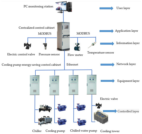 The network layer includes a strong cable, a weak-current control cable, and a weak-current data signal line and is responsible for connecting the control system as a whole. The application layer consists of the centralized control cabinet of the system and is a one-stop monitoring, recording, and control platform. It is responsible for showing the data visualization to the users and providing the users with the control interface of human–computer interaction, and it is also convenient for the user to issue control instructions and operate directly by hand. The user layer is the user of the product and the end object of the whole system service.