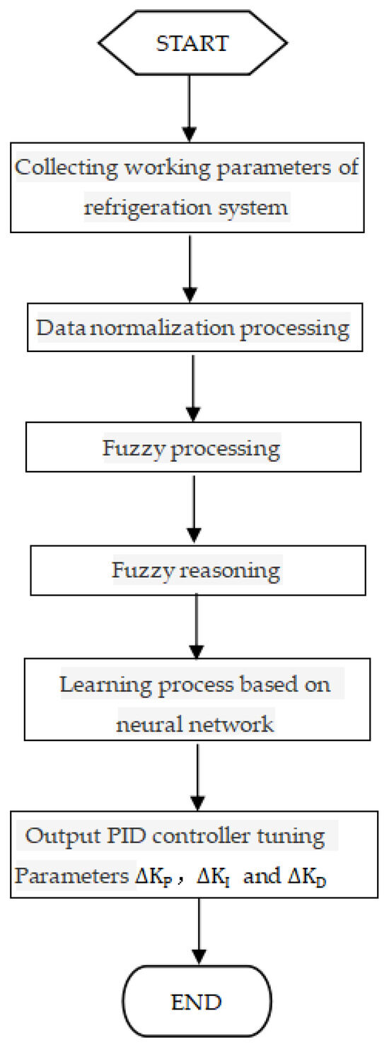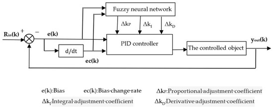 The original refrigeration station did not use bidirectional variable flow technology, and its control used simple PID control. As shown in Figure 3, this paper adopted bidirectional variable flow technology and used a fuzzy neural network to optimize the three parameters of the PID controller.
