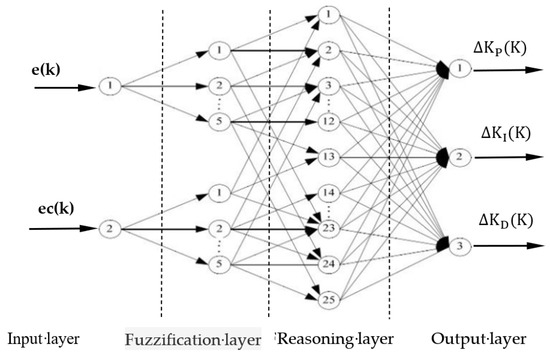 - Output layer: This layer includes 25 input nodes and 3 output nodes. This network layer transforms the normalized fuzzy rule values into the proportional (), integral (), and derivative () coefficients of the PID controller through a fully connected neural network, i.e.,where is the network output parameters, i.e., , , and , m = 1, 2, 3; is the connection weight in the fully connected neural network.