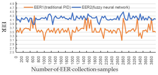 The building cooling load was calculated from the supply and return water temperatures measured by the sensors, and the system energy efficiency ratio was calculated from the measured system power, chiller pump frequency, cooling pump frequency, and cooling tower fan frequency. The EER distribution curves of the refrigeration station before and after the retrofit are shown in Figure 12 as EER1 (traditional PID) and EER2 (fuzzy neural network), respectively. From the analysis of Figure 12, it can be seen that before the refrigeration station was retrofitted, traditional PID control technology was used, and no chilled water bidirectional variable flow technology was introduced, so the EER was mostly around 3.6, only a few reaching above 4.1, indicating a low overall system EER. After the energy-saving retrofit, the chilled water system adopted bidirectional variable technology, and a self-learning fuzzy neural network algorithm was introduced to optimize the output parameters of the PID controller. Compared to the original PID control system, the EER was increased from 3.6 to 4.1, and the improvement ratio of EER was about 13.9%. This indicates that the combination of bidirectional variable flow technology and the fuzzy neural network algorithm can be used for energy-saving optimization control in actual refrigeration stations.