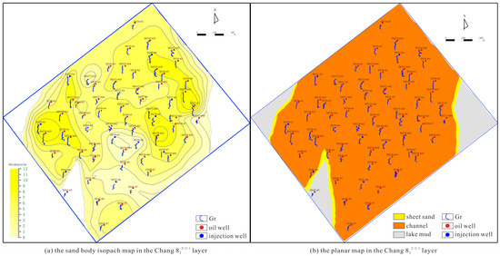 - The thickness of a single distributary channel sand body decreases from the center towards both sides. If there are differences or abrupt changes in the thickness variations between sand bodies, it is considered that the deposits are not from the same period. For example, wells D239-63, DJ239-641, and DJ237-644 exhibit a trend of thick–thin–thick (Figure 4c), indicating that a boundary between distinct distributary channels exists between them.