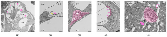Biometric measurements. (a) Longitudinal section of the cochlea at the level of the modiolus. The cross-sections of the cochlear canal are numbered from 1 to 4 and grouped into three regions: apex (1); middle (2, 3); base (4). (b) Hair cells were counted only if they showed a nucleus and were then classified as inner hair cells (IHCs, yellow arrowhead) and outer hair cells (OHCs, pink arrowheads). (c) Neuronal density was measured by counting neurons with well-visible nuclei (white +) in the Rosenthal canal (highlighted in pink). (d) The stria vascularis is highlighted in pink, and the arrows indicate examples of thickness measurement sites. (e) Regarding the glomerular investigations, the glomerular area (highlighted in pink) did not include the Bowman’s capsule. The glomeruli were identified in the equatorial section, where the convoluted proximal tubule (pink arrow) opened at one pole and the arterioles were observed at the other (pink empty arrow). (a) Scale bars = 20 μm, magnification 100X. (b–d) Scale bars = 50 μm, magnification 200X.