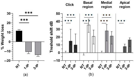 For each treatment group, weight loss from day 1 to 5 (a) and ABR threshold shifts (TS) (b) were reported according to the frequency range. The mean and standard deviation of the weight change reported for each group were expressed as percentages. One-way analysis of variance (ANOVA) and Bonferroni’s multiple comparison test were used to analyze differences in weight loss among groups. The median and quartile intervals of TS reported for each group according to the frequency ranges were expressed in decibels (dB SPL). Kruskal–Wallis and Dunn multiple comparison tests were used to analyze differences in ABR TS between treatment groups. NT: control group; 1-IP: group with one cisplatin bolus (14 mg/kg); 3-IP: group with three consecutive doses of cisplatin (4.6 mg/kg); *** = p-value < 0.001.