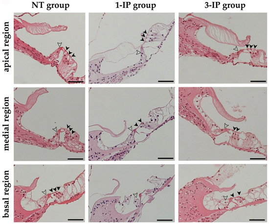 Histological investigation of hair cell damage. Sections of the organ of Corti stained with hematoxylin-eosin in NT group, 1-IP group, and 3-IP group, respectively, at the apical, medial, and basal region of the cochlea. Black arrowheads indicate outer hair cells (OHCs), and clear arrowheads indicate inner hair cells (IHCs). Bar = 50 μm. Magnification 200X.