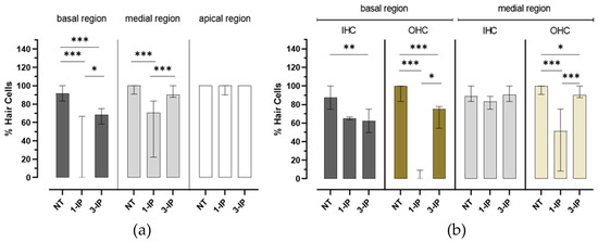 Hair cells count. (a) Number of hair cells in the three experimental groups according to the cochlear regions, respectively, the basal region (dark gray color), the medial region (light gray color), and the apical region (white color). (b) The percentage of hair cells present in the basal and medial regions of the cochlea in the three experimental groups was reported based on the type of hair cells. The median and quartile intervals of hair cells (HCs) reported for each group were expressed as a percentage. Kruskal–Wallis and Dunn’s multiple comparison tests were used to analyze differences in % of HCs among the treatment groups. NT: not-treated animals; 1-IP: animals treated with one cisplatin bolus; 3-IP: animals treated with three consecutive cisplatin doses (IHCs: inner hair cells; OHCs: outer hair cells; *: p < 0.05; **: p < 0.01; ***: p < 0.001.