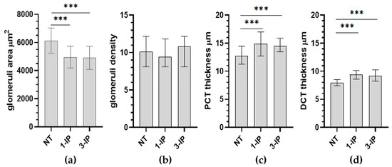 Analysis of histological examination of kidney damage in the three experimental groups. (a) Glomerular area among the groups, where the mean and standard deviation are calculated for each group and expressed in the µm2; differences in glomerular area among the groups were analyzed using one-way ANOVA and Bonferroni’s multiple comparison test. (b) The number of glomeruli per area is reported as the median and quartile intervals for glomerular density. (c) The lumen thickness of proximal convoluted tubules (PCTs) is measured in µm and reported in median and quartile intervals. (d) The lumen thickness of distal convoluted tubules (DCTs) is measured in µm and reported in median and quartile intervals. The analysis of differences among treatment groups in glomerular density, PCT thickness, and DCT thickness was performed using Kruskal–Wallis and Dunn’s multiple comparison tests. NT: not-treated animals; 1-IP: animals treated with one cisplatin bolus (14 mg/kg); 3-IP: animals treated with three consecutive cisplatin doses (4.6 mg/kg); ***: p < 0.00.