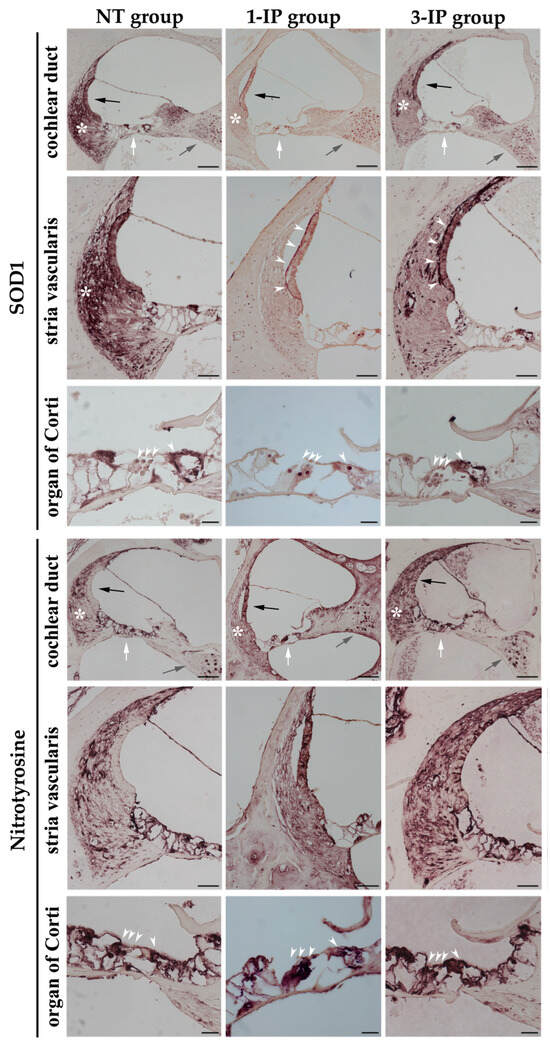 Detection of oxidative stress by immunohistochemical analysis. Cochlear tissues in all three experimental groups were stained with anti-SOD1 and anti-nitrotyrosine, respectively, in the NT group, 1-IP group (14 mg/kg), and 3-IP group (14 mg/kg). Details of the cochlear basal region: (1) cochlear basal duct highlighting the stria vascularis with black arrows, the spiral ligament with the white asterisk, and the organ of Corti with the white arrows; the spiral ganglion is highlighted with the gray arrows; (2) stria vascularis highlighting the stained spiral ligament with asterisks, and the stained marginal cells of the stria vascularis are highlighted with arrowheads; (3) organ of Corti highlighting the hair cells (including those that are not present) with white arrowheads. Bars 200 μm and magnification 100X (cochlear duct); 50 μm and 200X (stria vascularis); 20 μm and 400X (organ of Corti).