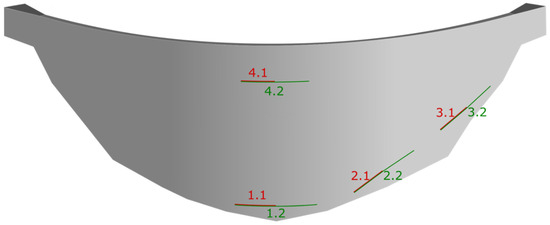 To provide a more general analysis, a set of 14 cracks of the most common shape and location for arch dams was simulated [48] (to avoid restricting the study to only the most likely cracks for the particular geometry of the 3D design). The set was completed, symmetrically, with the addition of two more cracks (denominated 4.1U and 4.2U), although these two additional cracks would only appear due to specific design or construction failures. The cracks were simulated independently; they never coexisted in the same model in order to generate more understandable information.