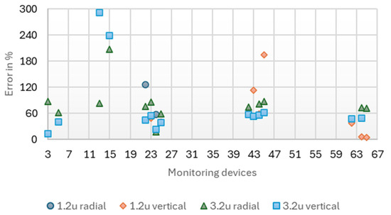 These figures demonstrate that the horizontal distance between the crack and the measurement point significantly affects crack detection. The difference between whether the measuring point is 20 m or 40 m horizontally away may determine detection capability. Regarding monitoring device precision: