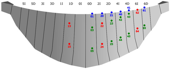 Identification numbers for virtual monitoring devices for dam displacement measurement (first digit points to the cantilever identification). Red: location of actual devices; green: additional internal devices; blue: additional devices on the crest.