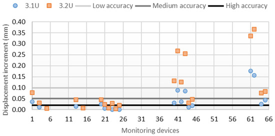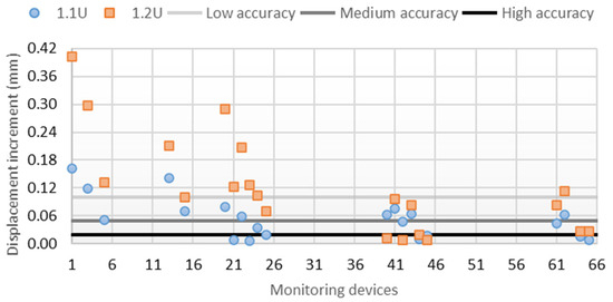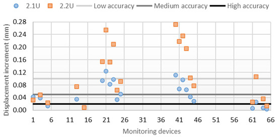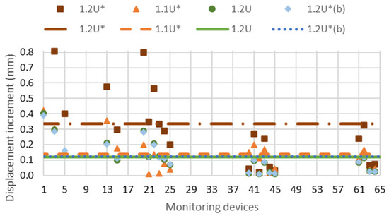 For the upstream crack position, the openings resulted in 1.48 mm (1.1U) and 1.53 mm (1.2U). It can be observed that the maximum increment of radial displacement due to the crack is 0.4 mm (Figure 6). It is not intuitive that displacement in devices 40 and 42 is higher for the shorter crack than for the longer one. The reason for this is that, in the cantilevers closer to the center of the dam, the displacement increases occur downstream, while near the abutment, the displacement increases are in the upstream direction. Doubling the crack length shifts the point where the increments change direction from cantilever 2D to 4I, and thus the increments change from the downstream direction to the upstream direction at points 40 and 42. On the other hand, the downstream crack position does not open and produces changes generally below 0.005 mm.