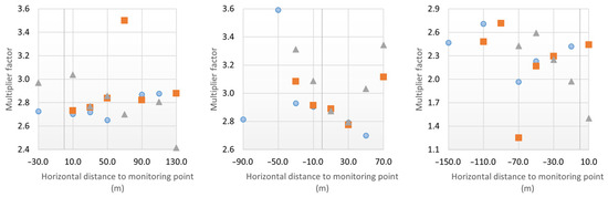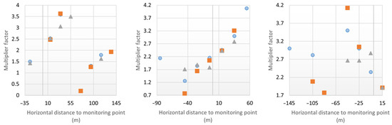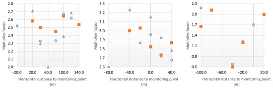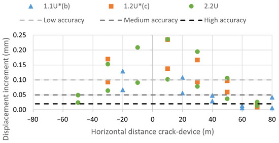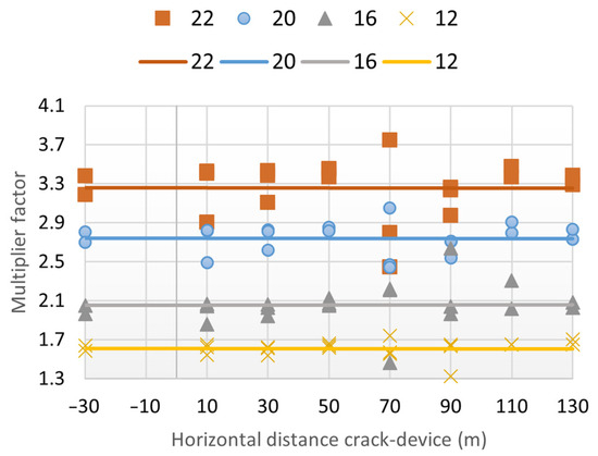 An analysis was conducted to evaluate the effects of doubling the crack length on changes in recordings (Figure 9). Displacement increments below 0.01 mm were excluded to prevent distortion from relative comparisons of small values. After removing outliers, the average multiplication factor for doubling crack length was 2.34. A trend shift was observed as displacement transitioned from upstream to downstream, at values of 65 m (crack 1), −65 m (crack 2), and −75 m (crack 3).
