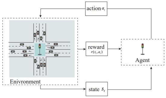 The classic Markov Decision Process (MDP) is composed of a five-tuple: . Here, S represents the state space; A denotes the action space; P is the state transition probability function, expressed as , representing the probability of transitioning to the next state after taking an action in a given state ; R is the reward function, expressed as , indicating the feedback received after executing an action in a given state ; is the discount factor, representing the degree to which recent feedback influences future rewards, with . Intersection signal control, as a traffic management strategy, can optimize traffic flow and reduce congestion. By adjusting signal timing through an intelligent signal system, intersections can be managed flexibly according to real-time traffic flow, thereby optimizing intersection performance. When addressing the signal control problem, it can be regarded as an MDP.