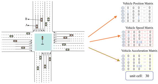 Taking the state space of the north entrance road as an example, the position information matrix corresponds to vehicles A and B at 0 m and 15 m from the stop line, and the processed velocity and acceleration information is entered into the matrix as illustrated in Figure 2.