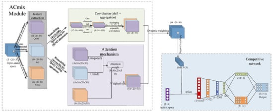 Based on the Rainbow DQN framework, we designed an efficient and comprehensive Rainbow DQN_AM model by introducing the ACmix module to address the discretized state space. Traditional CNN models excel at extracting local data features but struggle to capture sufficient global information. On the other hand, while LSTM models can capture temporal patterns, they lack effective spatial modeling capabilities. In intersection signal optimization, traffic flow is complex and dynamically changing, which requires models to have strong state information capturing abilities. Moreover, real-time signal optimization demands high computational efficiency to quickly process large amounts of state data. Combining sufficient state information extraction with rapid computation efficiency helps to enhance the model’s decision-making capabilities. Pan [43] explored the relationship between self-attention mechanisms and convolution and proposed the ACmix module, which integrates both. This module retains the advantages of convolutional layers, such as parameter sharing, sparse interactions, and multi-channel processing, allowing it to efficiently learn features, reduce computational load, and enhance the model’s expressiveness. Additionally, by incorporating the self-attention mechanism, the ACmix module can handle long-range dependencies and global information, enabling a more comprehensive capture of global features in intersection traffic flow. The integration of these two modules compensates for CNN’s limitations in capturing global features while maintaining computational efficiency, thereby improving the model’s performance in complex traffic flow environments. The network structure is shown in Figure 4.